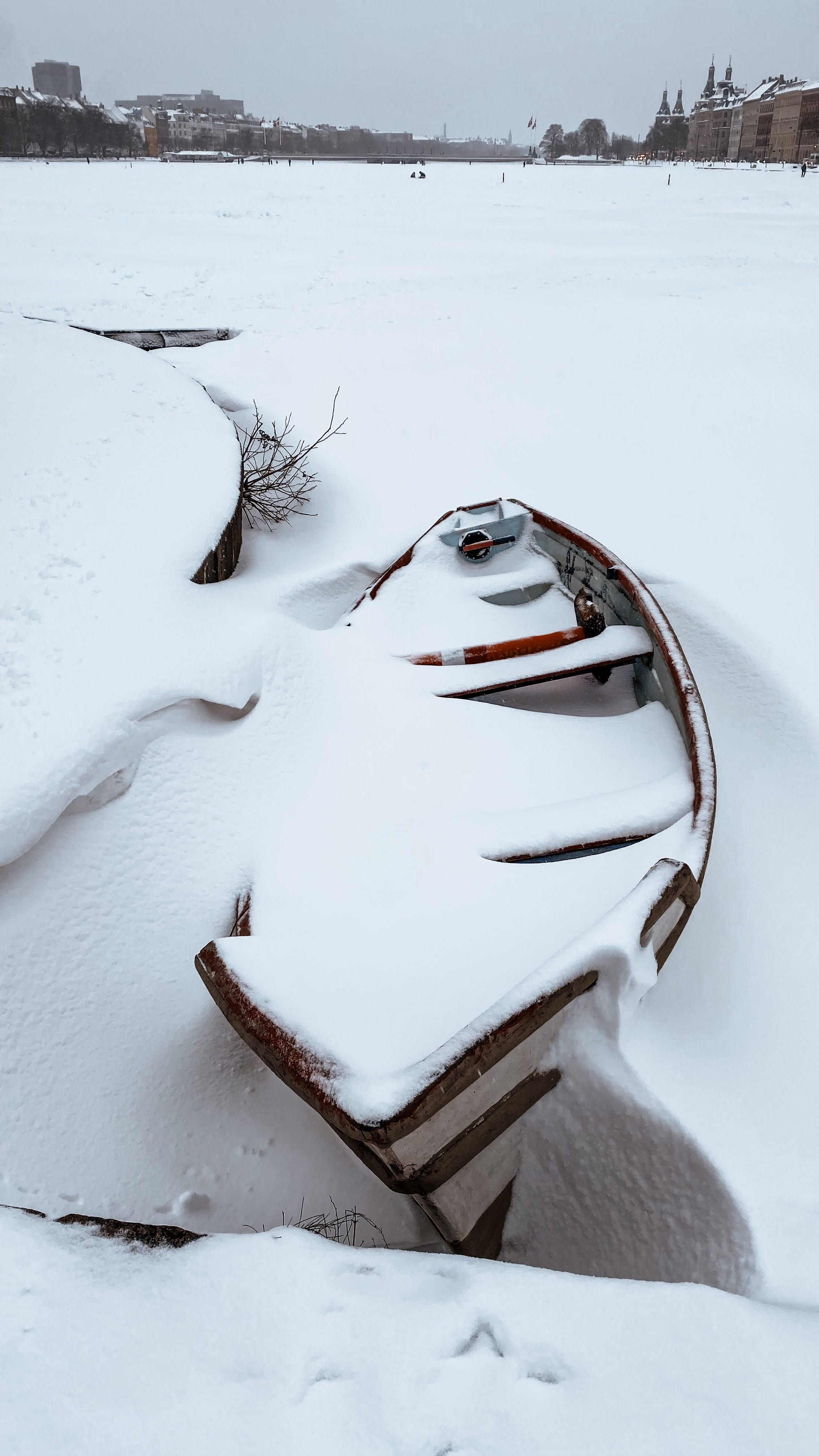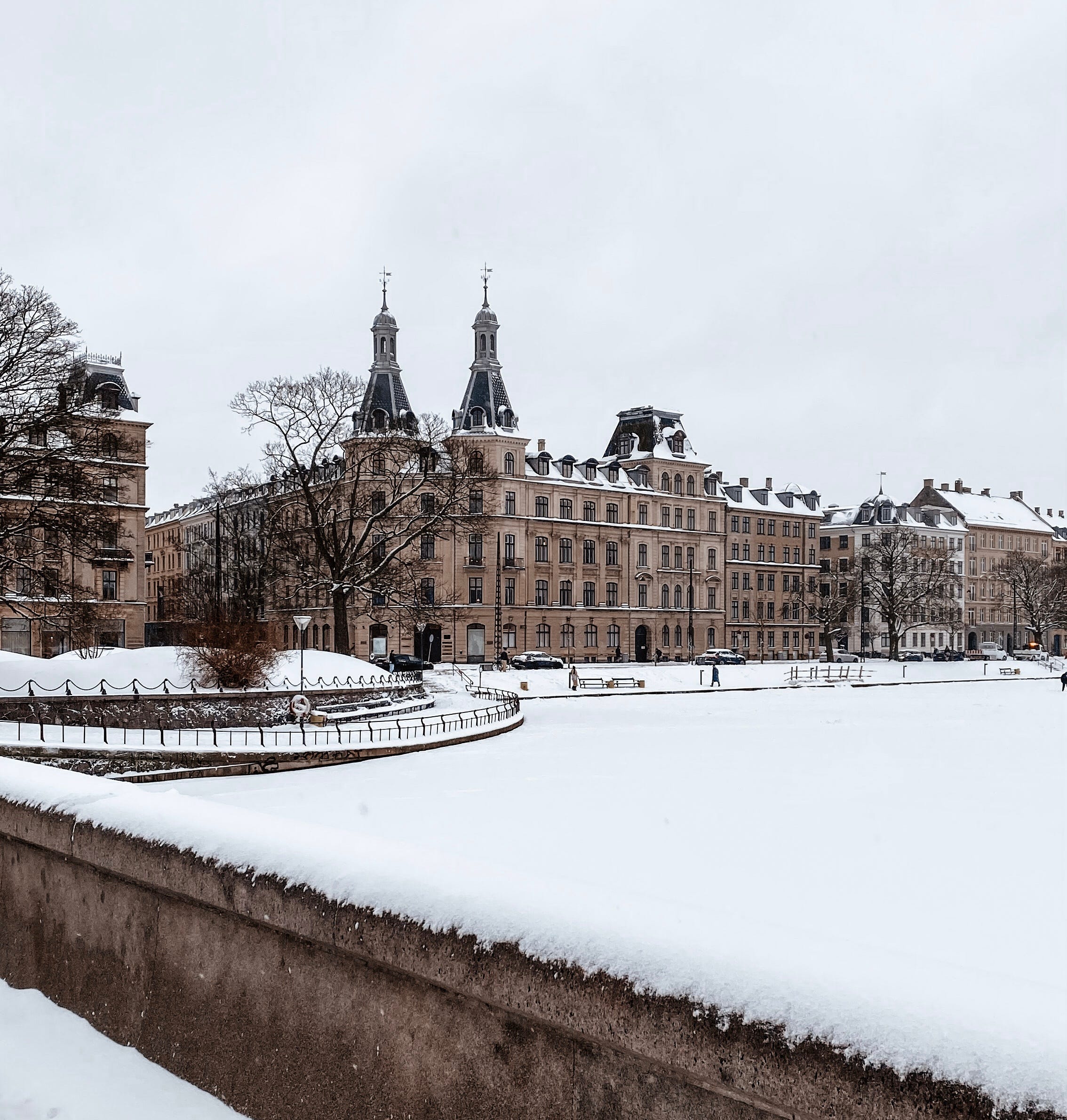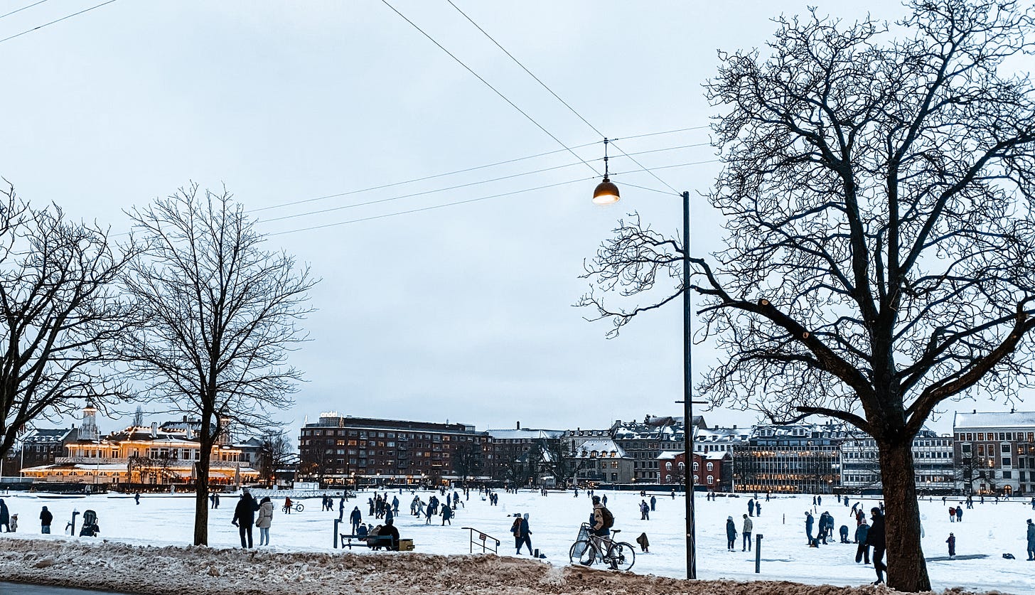 For the past weeks, Copenhagen has been SO bitterly cold, and by now the Copenhagen Lakes are frozen so solid that the authorities have declared them safe to walk on. A few days ago, heavy snow fell, so on this first Saturday in February the city has turned into a perfect old-fashioned winter wonderland. Hundreds of people have been out since early morning: walking, skiing, skating, playing, and gathering around tiny games of ice hockey played by children on the ice.